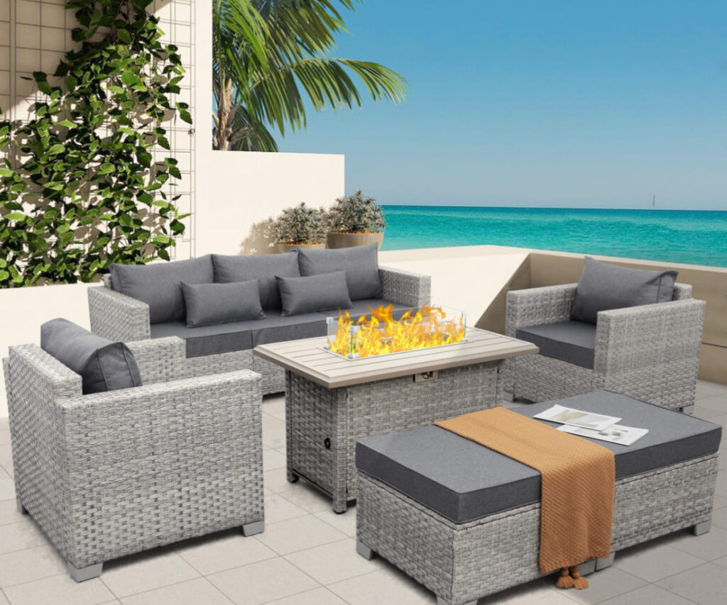 Designed for larger gatherings, this expansive set includes a 3-seat sofa, two single chairs, two ottomans, and a fire pit table, creating a cozy and inviting atmosphere for entertaining guests.